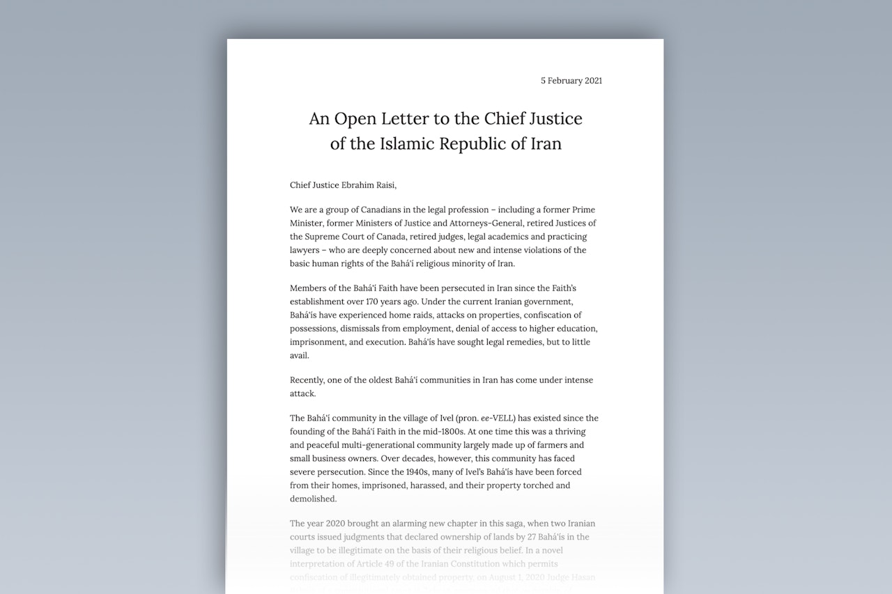 La carta, entre cuyos firmantes se encuentran ex ministros de justicia y jueces del Tribunal Supremo de Canadá, además de prestigiosos profesores de derecho y abogados en activo, condena una reciente sentencia por la que se confiscan las propiedades bahá’ís en Ivel, localidad al norte de Irán.
