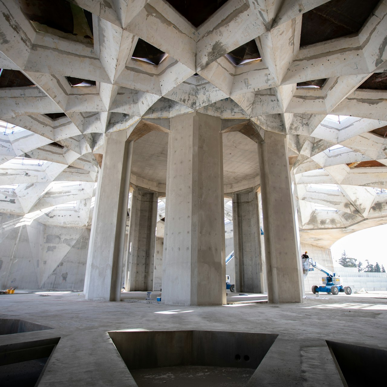 CENTRO MUNDIAL BAHÁ'Í — Se ha retirado el encofrado que daba forma a la pérgola del Santuario de ‘Abdu’l-Bahá, sacando a la luz su estructura completada. El Santuario se yergue como símbolo del incesante servicio de ‘Abdu’l-Bahá en pos de la unificación de la humanidad.