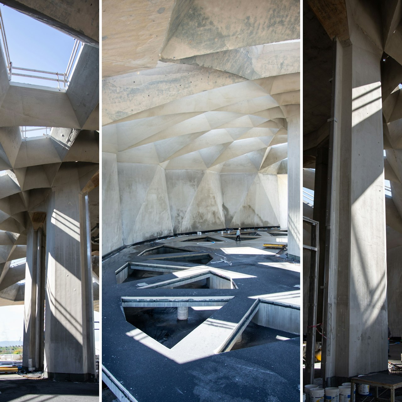 La lumière du petit matin filtre à travers les ouvertures de la structure en treillis désormais terminée. La couche imperméable a été appliquée sur la surface en béton.