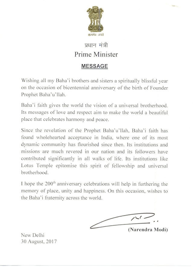 "Baha'i Faith gives the world a vision of universal brotherhood," wrote Prime Minister Modi in his letter to the Baha'i community of India. “Its messages of love and respect aim to make the world a beautiful place that celebrates harmony and peace."
