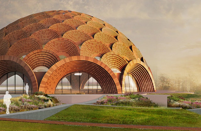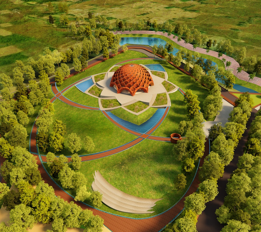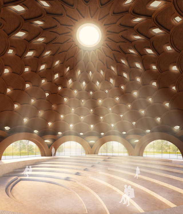 Drawing on patterns found in the Madhubani folk art of Bihar and the region’s long architectural heritage, the firm created a design with a repeating pattern of arches. The domed edifice will step up from nine arches at the base, multiplying until each segment appears to merge into a single geometry. Openings at the center of the dome and in each ring of arches will reduce the weight of the ceiling while allowing gentle light to filter in.