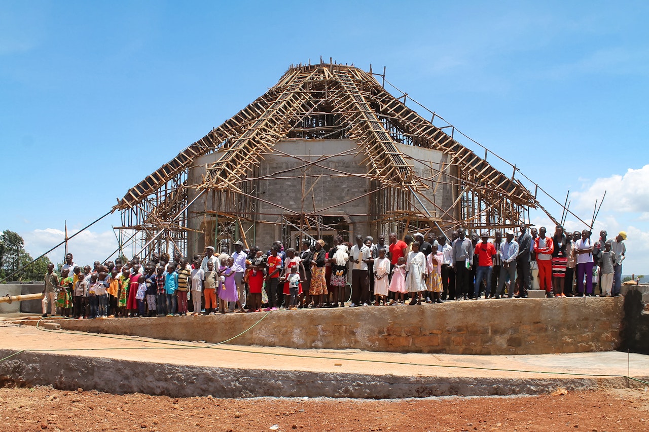 With the foundations laid for the central edifice of the House of Worship in Kenya, the temple’s nine walls have now been raised, and supports for the design’s elegant sloped roof are being put in place.