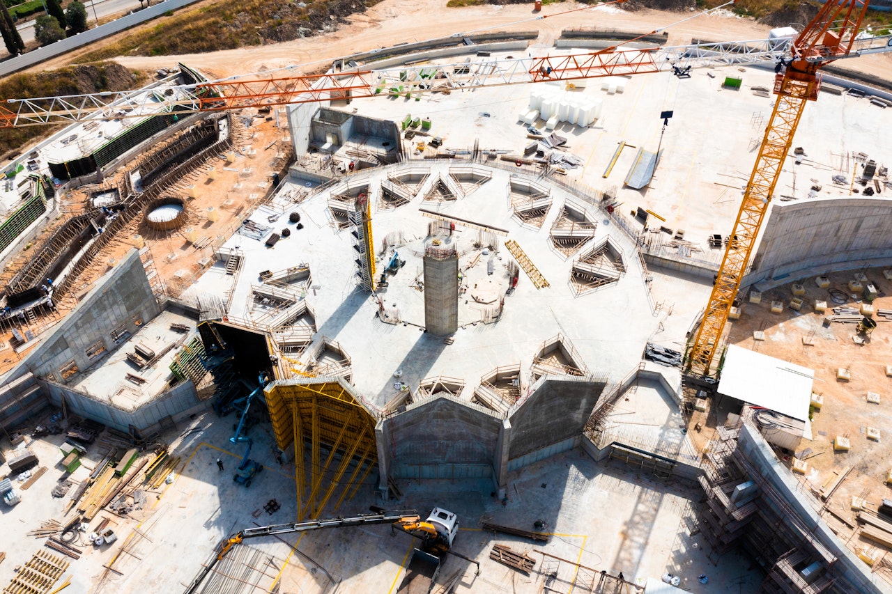 BAHÁ’Í WORLD CENTRE — The first two columns of the main edifice of the Shrine of ‘Abdu’l Bahá have been raised. Each now stands 11 meters above the central plaza floor.