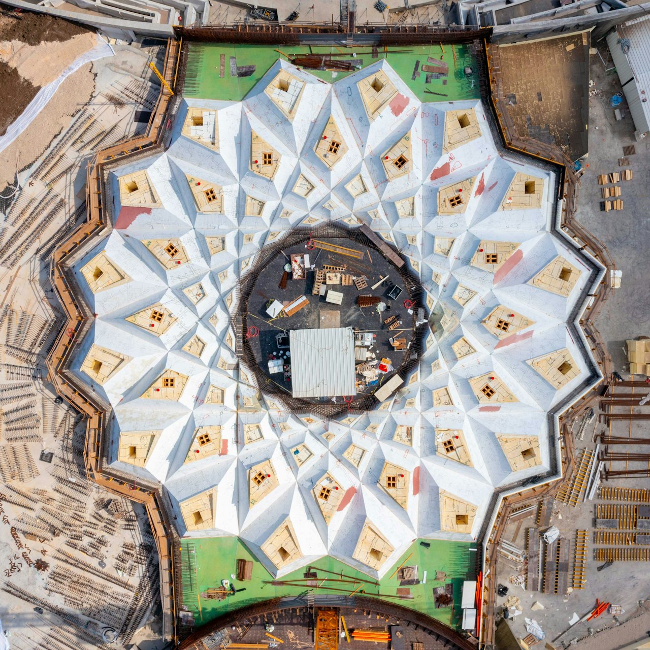 The project team has been meticulously laying the formwork for the trellis using expanded polystyrene (EPS) blocks that are specially cut to form valleys of negative space into which concrete will be poured, forming the intricate roof structure.