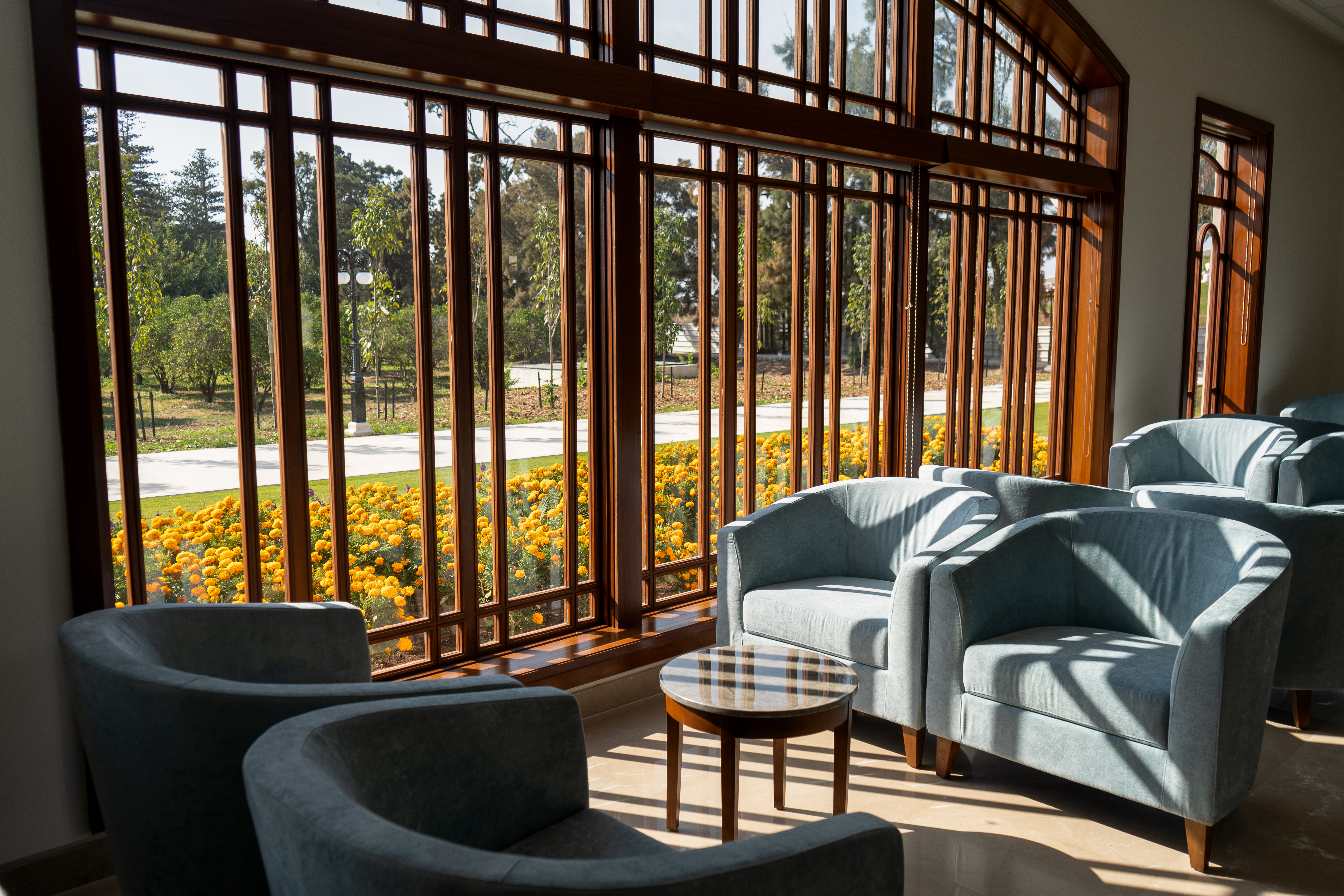 Left: Volunteers serving at the Bahá’í World Centre cleaning windows of the main hall of Visitors’ Centre. Right: The main hall offers various seating arrangements and tables where people can prepare for their visit to the Shrine.