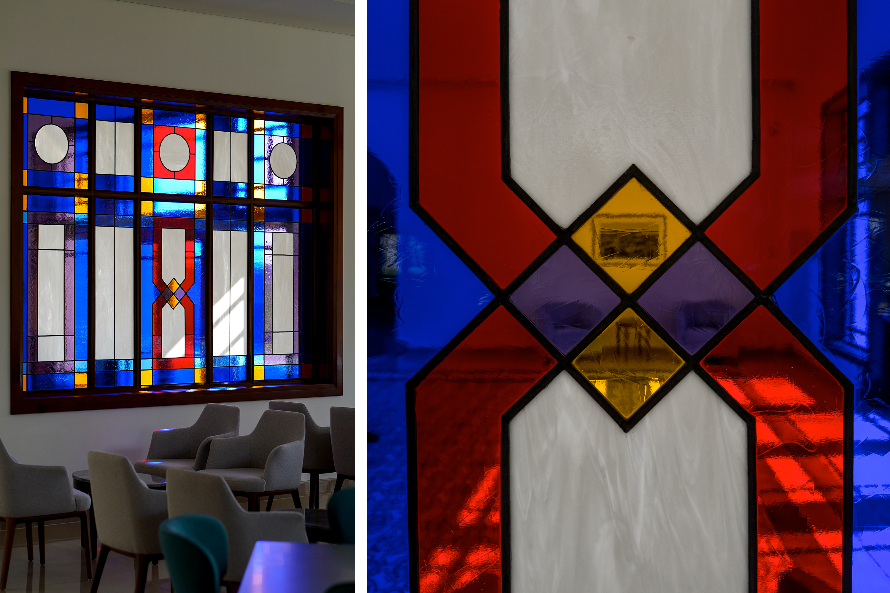 View of stained glass that allows light to shine through the foyer and the inside of the main hall.