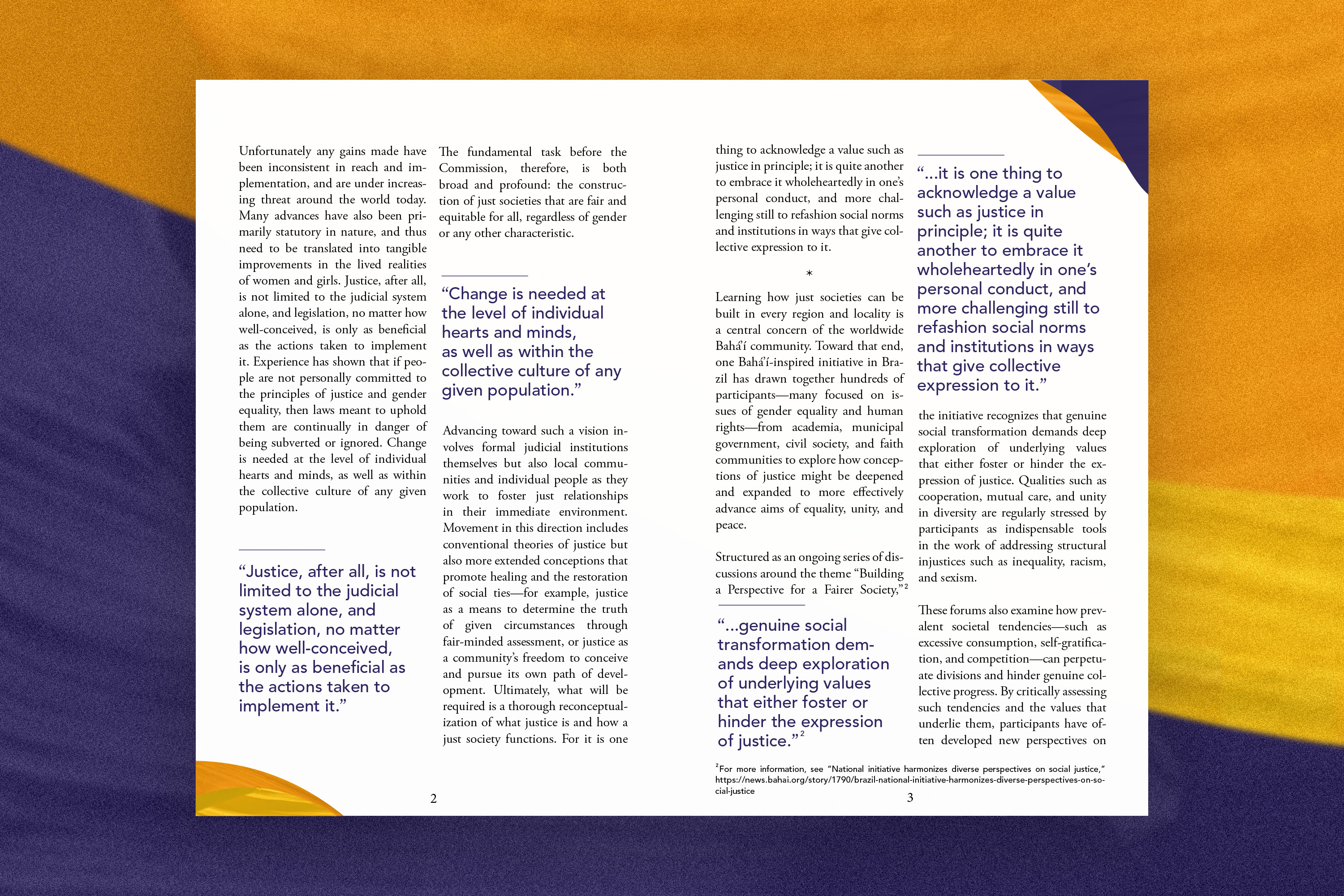 The statement draws on a Bahá’í-inspired national initiative in Brazil, where hundreds of participants from academia, government, civil society, and faith communities have come together in an ongoing series of discussions exploring how conceptions of justice can be deepened to more effectively advance equality, unity, and peace.